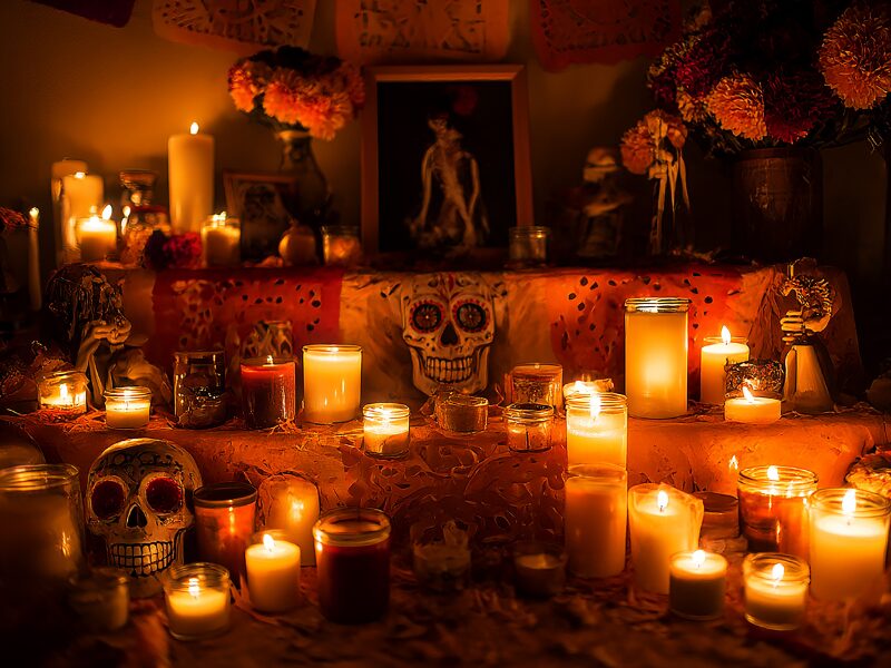Cemeteries become places of gathering rather than grief. Families visit graves, share meals, tell stories, play music, and decorate with candles and flowers. The night sky glows, and laughter mingles with the scent of tamales, mole, and roasted corn.