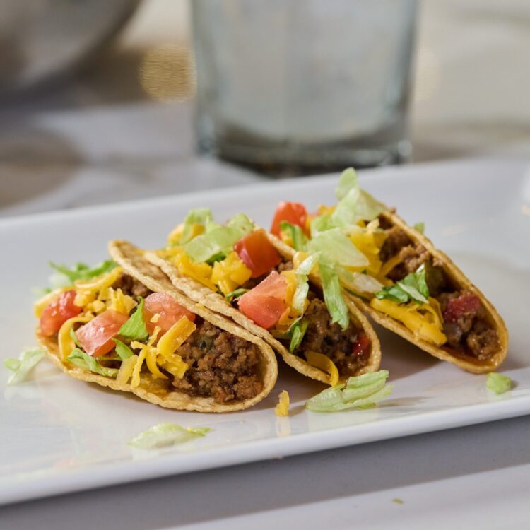 Mini Classic Tacos $6 – Three mini crispy tacos with seared ground sirloin, lettuce, cheddar cheese, tomato