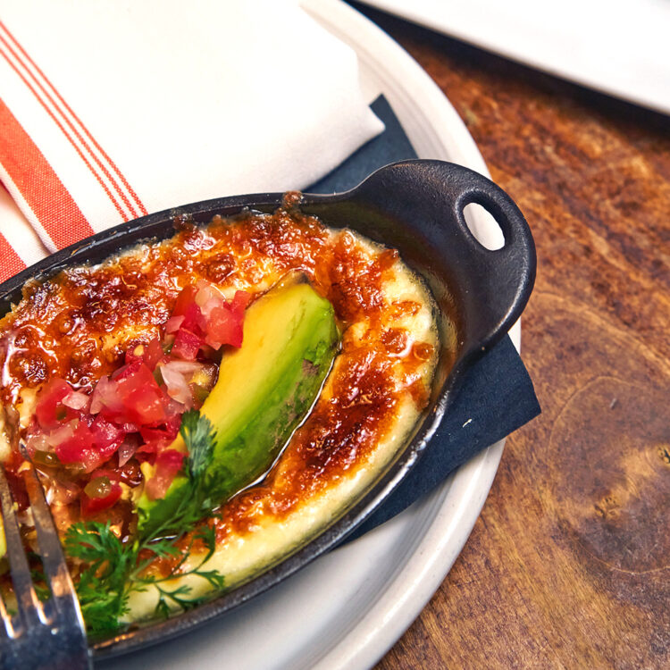 $12 Queso Fundido – Three cheese fondue, avocado, pico de gallo, corn tortillas. Add Chorizo or Mushroom +$3