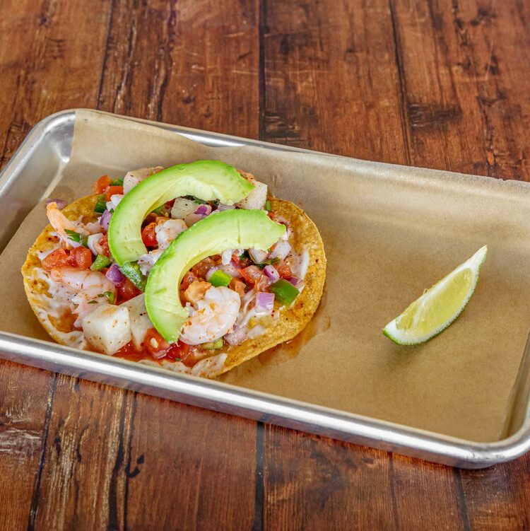 CEVICHE TOSTADA $5.50 – Cooked shrimp, tomato, red onion, avocado, cilantro, lime, jicama, layered with mayo on a local tajin tostada