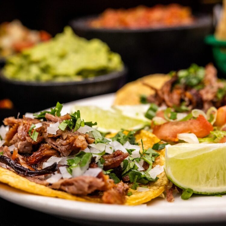 Street Tacos – Tortillas with carnitas, cilantro and white onion. Served with tomatillo salsa