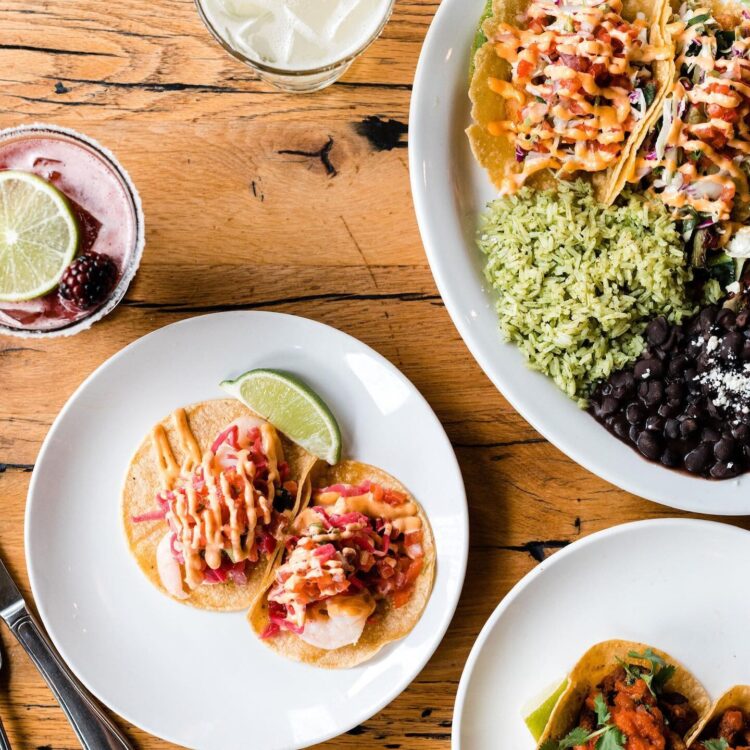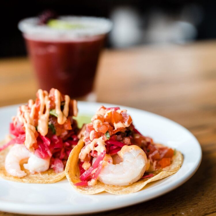 TACOS DE CAMARON – 2 per order – Garlic adobo shrimp, fresh cabbage, tropical pico, and pineapple habanero salsa.